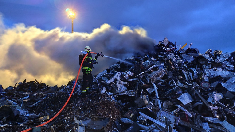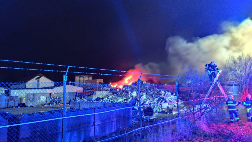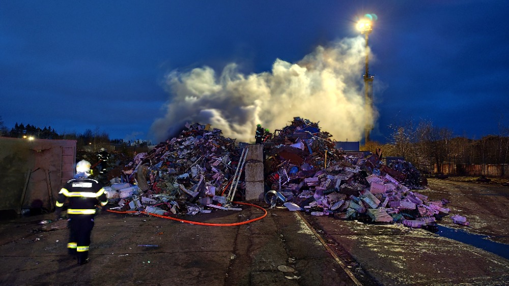 Jednotka vyjela do průmyslové zóny Pávov, kde došlo k požáru hromady drceného elektro odpadu a lehkých kovů.